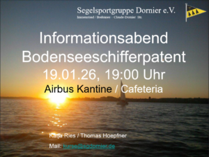Am Montag dem 19. Januar 2026 findet erneut unser Informationsabend zum Bodenseeschifferpatent statt.Interessierte und Mitglieder sind herzlich eingeladen. Die Veranstaltung beginnt um 19:00 Uhr in der Airbus Kantine in Immenstaad. Wir bitten darum, sich vorher per Mail an bei Katja Ries und Thomas Hoepfner anzumelden.